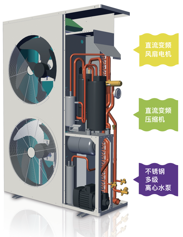 系统采用了全直流变频技术,配备了直流变频压缩机、直流变频风机和不锈钢多级离心水泵,多级叶轮,高扬程,使整机性能得到全面提升,能效更高、噪音更低!