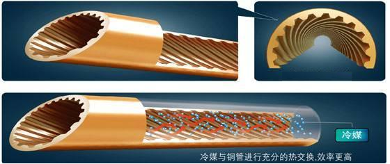 需要进一步强化耐高寒空气源热泵的内部换热,缩小应传热推动力不足而扩大的冷凝温度与蒸发温度的差值,提高主机的㶲效率。由于更低环温对应更低的冷媒蒸汽压,相应造成气相部分在蒸发器管道内的流速增加,但同时又受到摩擦阻力和声速限制,更会造成蒸发器管道内壁的换热效能未被充分发挥。因此,需要为蒸发器选择新型的管材,比传统带梯形槽的强化换热管或者更早期采用的光管,更有利于在高寒地区工作。