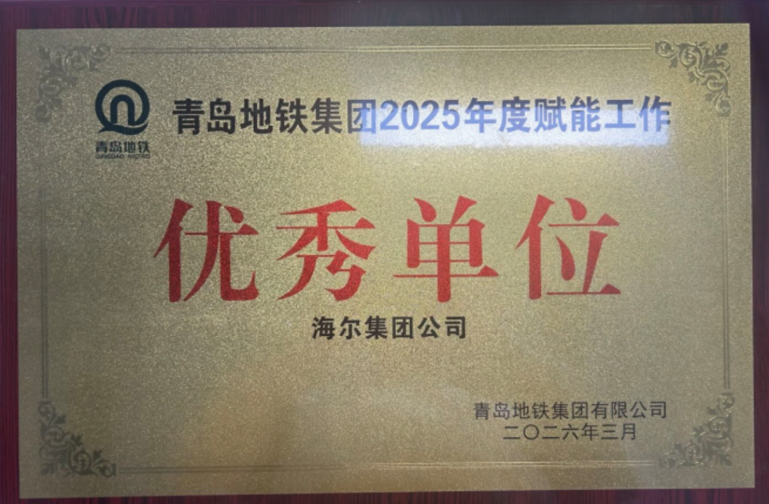 2025年,海尔承接青岛地铁多条线路的设备供货、质保及委外维保工作。工程履约团队在6号线一期、4号线、3号线、2号线二期等线路中持续提供稳定可靠的服务保障。其中6号线一期荣获地铁集团“优秀单位”称号,4号线维保项目连续多个季度获评优秀,3号线维保平稳运行,2号线二期供货顺利推进。地铁集团对海尔一年来的表现非常认可,授予海尔集团公司“优秀单位”奖牌。