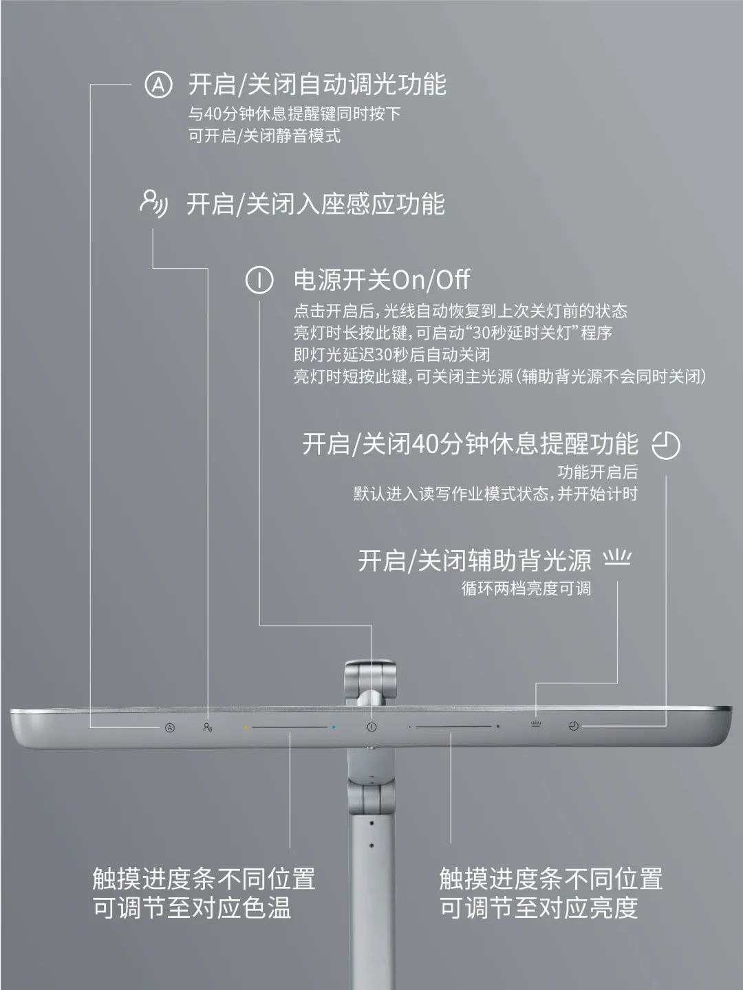 ●智能光感调节:搭载的光敏传感器实时监测用光环境光线变化,并自动匹配最适合的光源亮度,让桌面照度始终稳定在最适合的亮度阈值,不必再为灯光太亮或太暗而发愁;