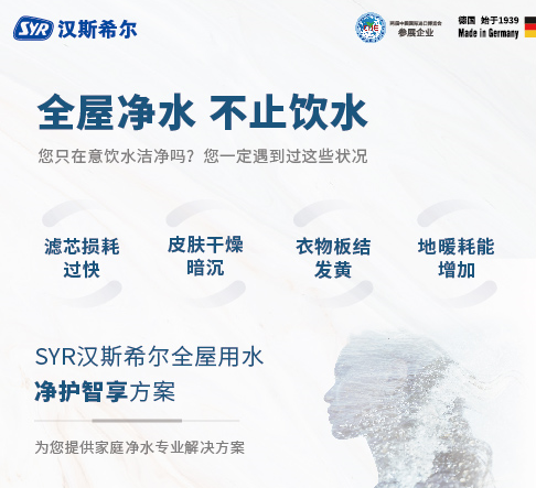 德国专业净水品牌SYR汉斯希尔,深耕净水领域80余年,秉承着“全屋净水,不止饮水”的健康用水理念,提供前置过滤、末端净水、中央软水、中央净水、防漏保护、防污隔断等全方位净水产品品类,从“净、护、智、享”多个维度,为用户带来高品质、国际化的生活方式。