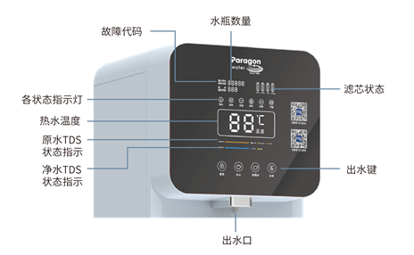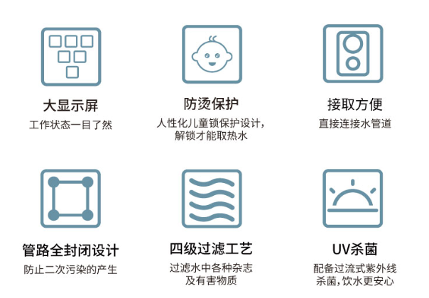 除此之外,此款商务直饮机还采用了整机管路全封闭设计,可从入水、储水到出水整个环节,有效减少细菌的滋生,进一步防止二次污染的产生。以及人性化的儿童锁保护设计,防烫保护,必须解锁才能取热水;灯光显示水温,防止误操作,出水温度实时监测。一目了然,操作透明简洁。