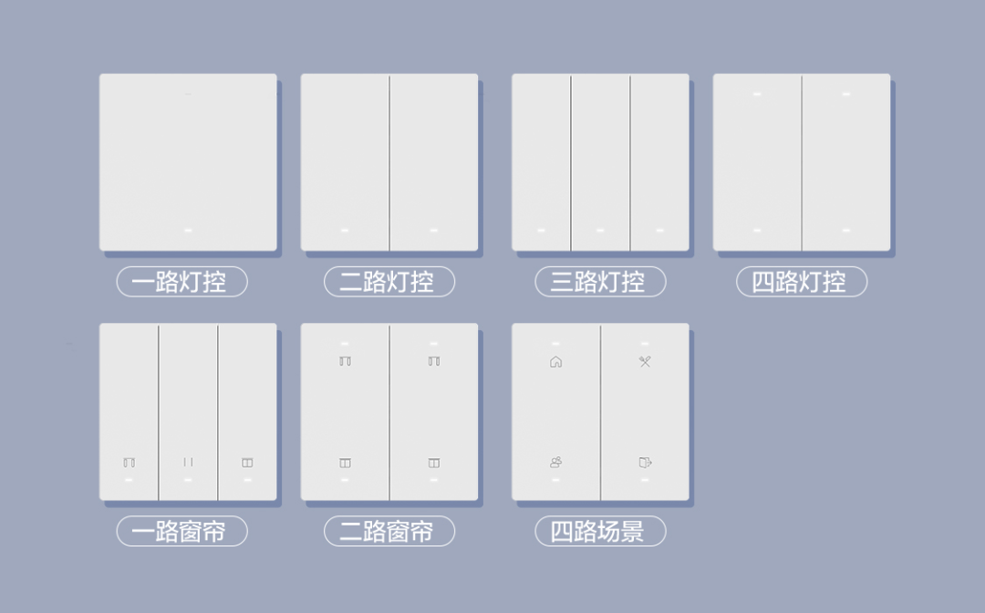 萤石玲珑系列智能面板SW6,分为灯控、窗帘、场景三大类型,可随心搭配。