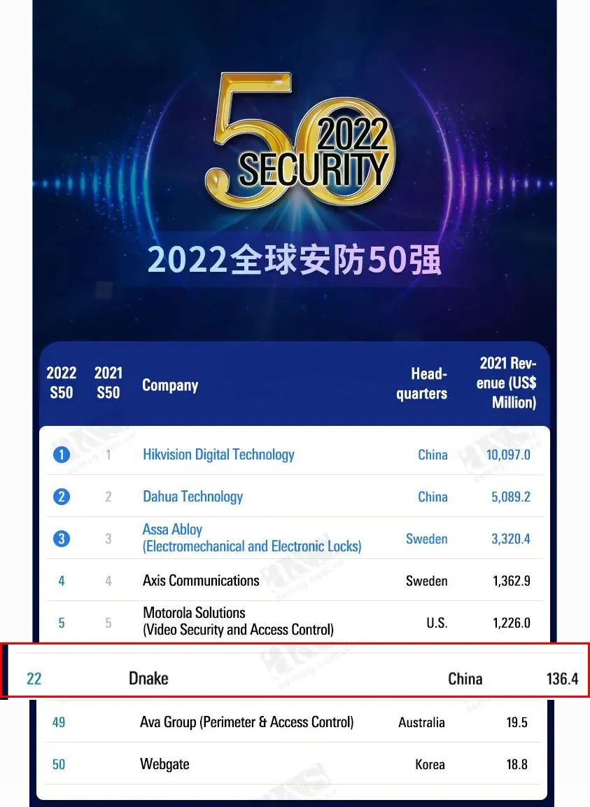 狄耐克位居a&s全球安防50榜单第22位!