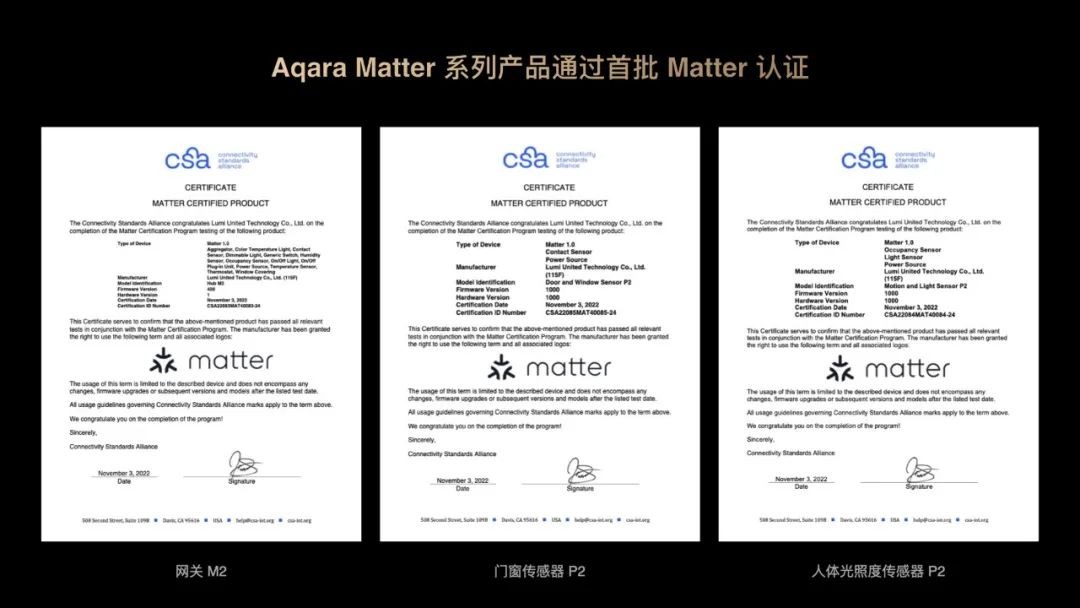 此外,Aqara 已成为首批获得 Matter 认证的品牌之一,目前 Aqara 网关 M2、门窗传感器 P2、人体光照度传感 P2 已通过 Matter 认证,进一步推进了 Matter 协议在全球的普及和落地。