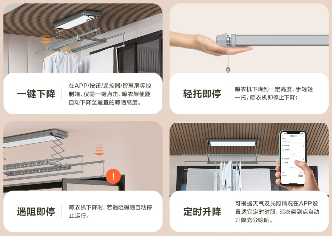遇阻即停:晾衣架下降时,若遇阻碍则自动停止运行;