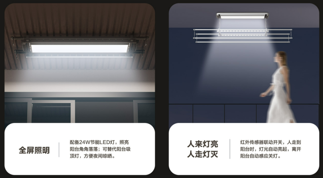 全屏照明:配备24W节能LED灯,照亮阳台角角落落;可替代阳台吸顶灯,方便夜间晾晒;