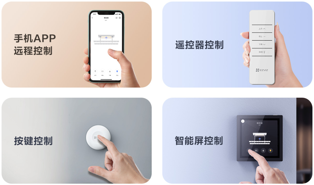 支持手机APP远程控制、遥控器控制、智能按键控制、智能中控屏控制、3种语音控制:“你好萤石,晾衣架上升”、“天猫精灵,晾衣架下降”、“小度小度,打开晾衣架照明”~多种控制方式,怎么方便怎么用。(*提及产品需另外购买)
