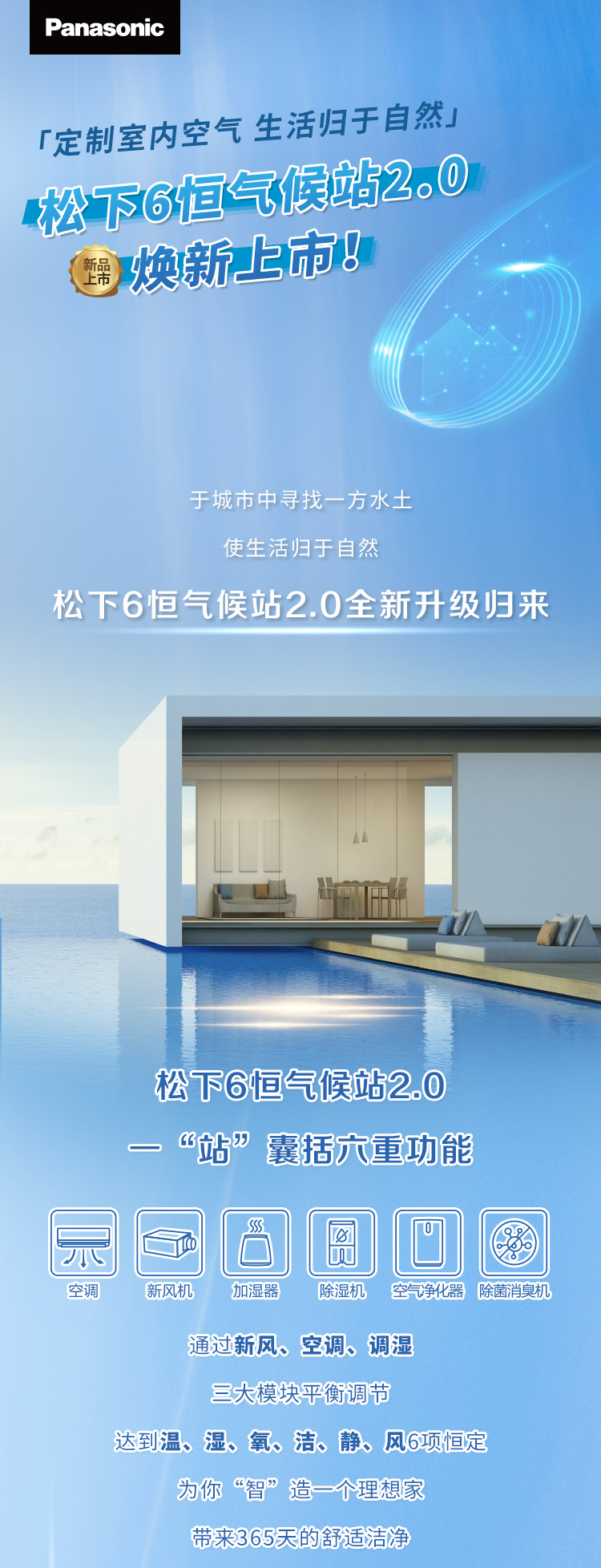 在目前的装修市场,越来越多的用户选择一站式全屋整装,以达到统一美观的居家环境。对此,松下推出6恒气候站2.0从空间、通风、隔音、睡眠、健康等功能出发,为不同的家庭需求、生活方式等推出多种一站式全屋环境解决方案,为消费者“智”造一个理想家。在保证家庭基本需求的情况下,松下6恒气候站2.0打破原有产品的壁垒,通过新风、空调、调湿三大模块平衡调节,其中,调湿模块在1代的基础上新增ziaino次亚诺除菌技术,结合离心水破碎技术,双管齐下,有效去除多种细菌、异味,保障健康的居家环境。再配合空调模块的高浓度nanoe™X(纳诺怡™X)技术深化清洁效果,双重净化,以达到家庭环境365天的舒适洁净。