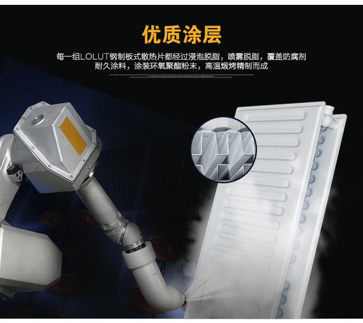 推荐您使用劳力特钢制板式暖气片,它采用EN10103冷轧制作而成,散热性强,采暖高效节能;同时,采用电泳+烤漆工艺,通过浸泡脱脂、喷雾脱脂,覆盖防腐剂耐久涂料,涂装环氧聚酯粉末,高温锻烤精制而成,漆面美观且抗腐蚀能力强。