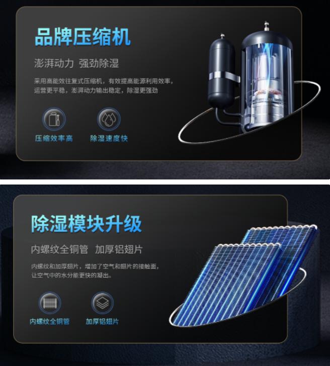 纽诺畅爽系列采用知名品牌压缩机,搭配沟槽螺旋纹铜管技术的冷凝器,可将潮湿空气快速冷凝成水,让地下室远离潮湿,干爽舒适。