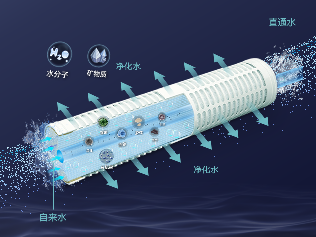原水经增压后进入超滤膜组件内的毛细管式超滤膜内腔,原水中的细菌、藻类、悬浮物、胶体和其他大分子有机物等被超滤膜截留,净水从膜壁四周渗出,汇集成为净化水,出水水质达国家《生活饮用水卫生标准》(GB 5749-2022)。