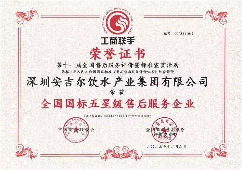 安吉尔荣获“全国国标五星级售后服务企业”称号