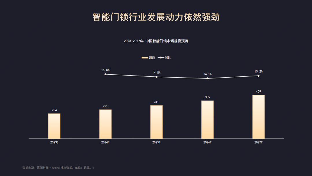 据洛图科技数据预测,2023年中国智能门锁全渠道销量将达1900万套,市场规模将突破230亿元。