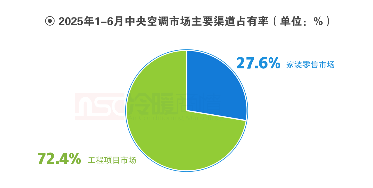 据冷暖商情统计数据显示,2025年上半年,中央空调工程项目市场在整体市场中的占比达到72.4%,较2024年上半年70.5%的占有率提升1.9个百分点。但工程项目市场受到商业地产投资放缓、基础设施建设节奏调整等因素影响,整体增长较为乏力。