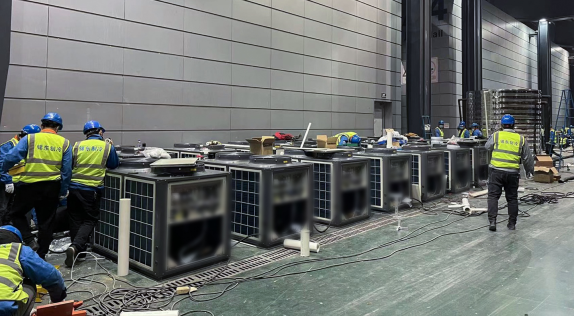 无锡应急方舱医院由无锡太湖国际博览中心改建而来,6万多㎡的展馆改建后共可容纳1500余人在此隔离、治疗等。为满足方舱内医患短时间集中用水的需求,当地设计院为该项目配置了36台10HP的热泵热水机组,以保障系统在一两个小时内迅速升温至55℃以上,甲方还要求整个项目在5天内完成施工。