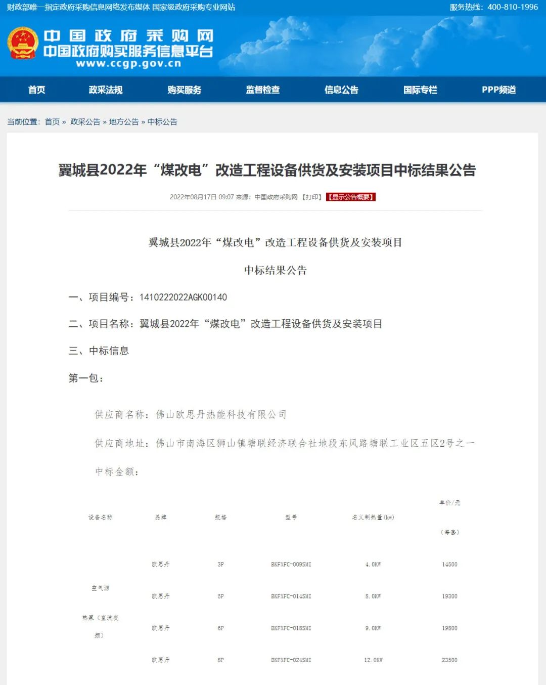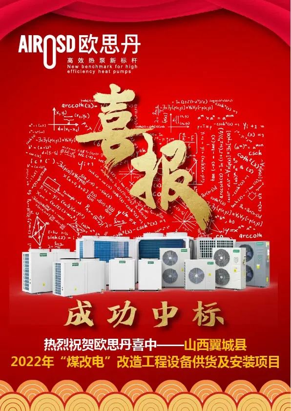 近日,中国政府采购网发布《翼城县2022年“煤改电”改造工程设备供货及安装项目中标结果公告》中,欧思丹在众多优秀空气能厂家中脱颖而出,成功中标!