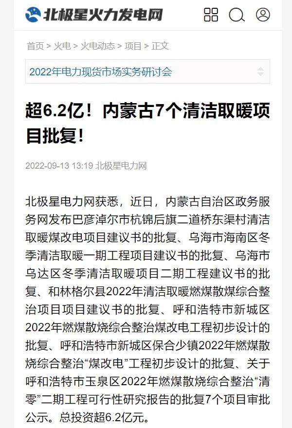 6.呼和浩特市新城区保合少镇2022年燃煤散烧综合整治“煤改电”工程初步设计的批复,总投资8672.4万元