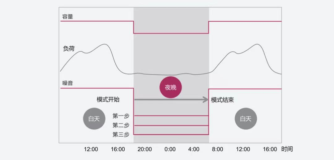 此外,机组还具有夜间低噪音运行功能。当启动低噪音功能后,机组可根据室外最高温度自动调低风机转速,降低噪音,从而打造静音空间,让家人在夜晚拥有一片宁静空间和舒适高质量的睡眠。