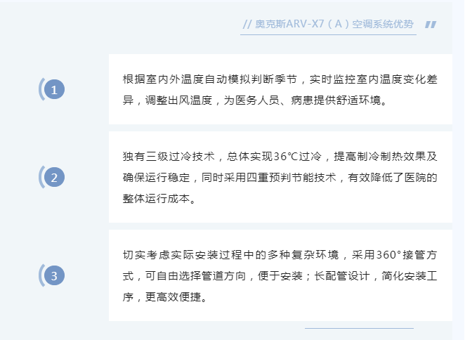 在本次项目中,奥克斯中央空调围绕用户需求,选择的ARV-X7(A)系统空调系统具有舒适静音、高效节能、安装便捷等出众优势,不仅极大程度上符合了方舱隔离点对空调的需求,还有效降低方舱医院运行的能源成本。