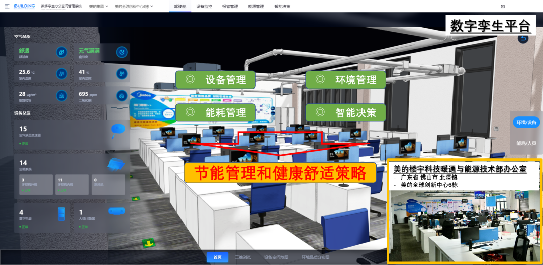 基于iBUILIDING美的楼宇数字化平台,搭建的数字孪生办公空间管理系统,相比传统的数字化管理方式,可以实现物理世界和现实世界之间的全面感知、精准映射、智能推演。将数字孪生技术与舒适性技术结合,实现了室内环境可视化管理全新体验、全周期闭环管理、仿真预警和优化。