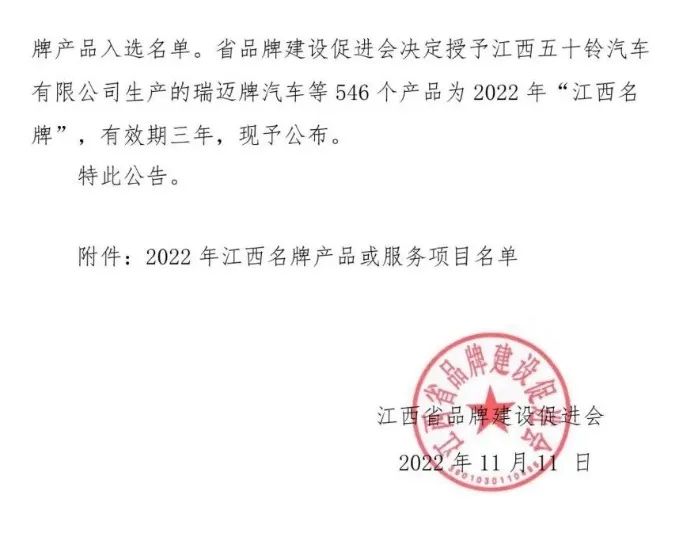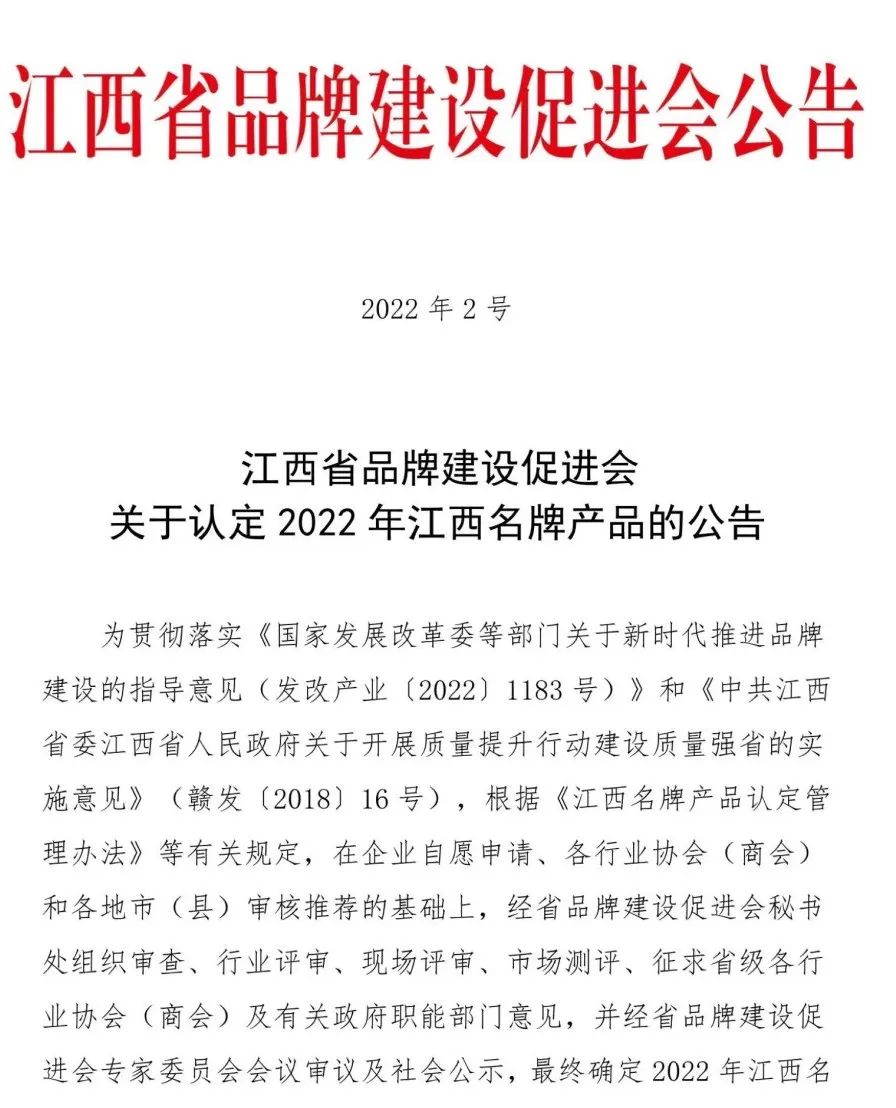 江西名牌产品,是指在江西省境内生产,品质水平、市场占有率、用户满意度和知名度居本省同类产品前列,并按规定程序认定的产品。“江西名牌产品”以公平、公正、专业、权威为准则,以市场评价、质量评价、效益评价、发展评价和社会责任评价为主要评价内容的评价指标体系,形成江西省内参与度最高,规模最广,影响力最大的盛会,多年以来为江西品牌发展赋能,为江西品牌发声。