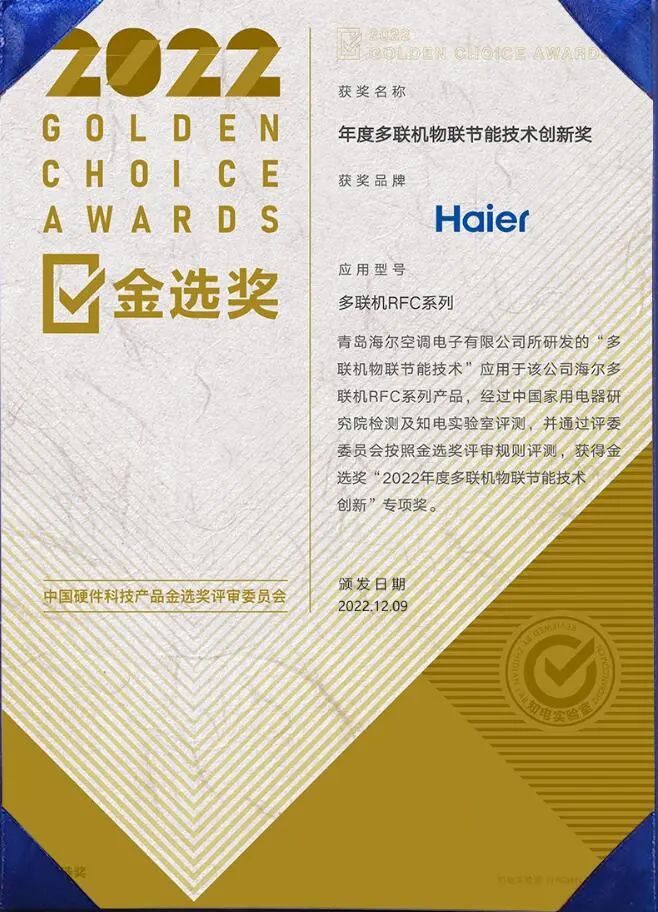 在评审专家一系列专业、严苛的测评下,海尔多联机RFC系列斩获了金选奖“多联机物联节能技术创新”专项奖,成为物联多联机领域唯一获奖品牌。