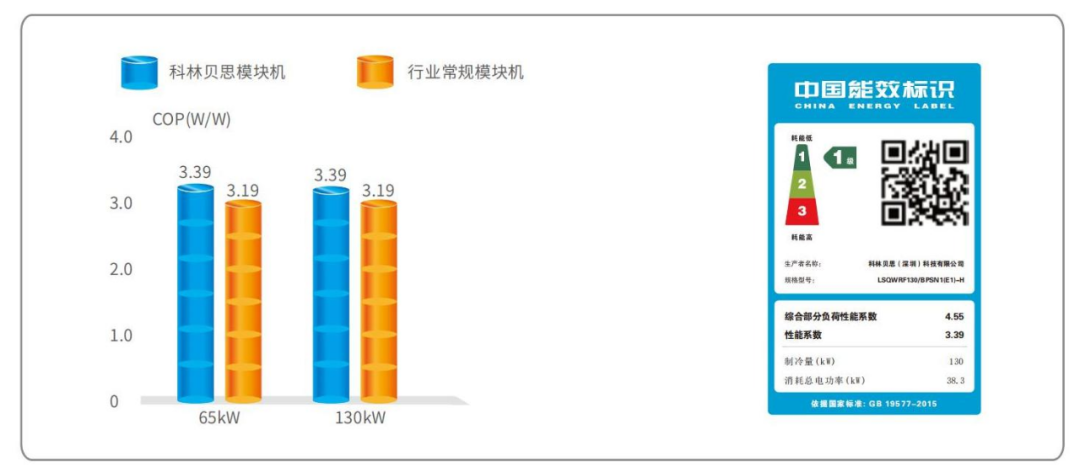 科林贝思模块机组集高效压缩机,新一代高效换热系统,高精度电子膨胀阀等专业部件于一体,使得全系列机组COP均达到国家一级能效指标,获得国家节能产品认证。