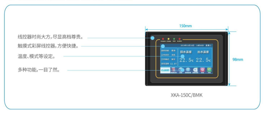 单个线控器最多可对8台模块机组实现集中控制,管理机组的启停顺序,同时用户通过线控器能够及时了解机组的运行状况和故障状态。