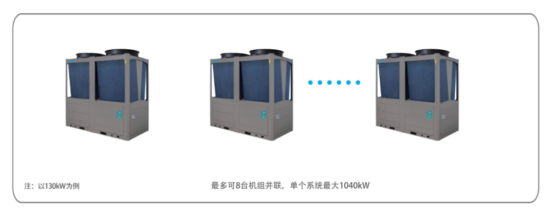不同容量规格的单元模块可自由组合,最大可实行8台并联,兼容性扩展性强,用户根据安装现场的场地特点,可以选择多种组合连接方式,实现1~8台模块并联使用,最大冷量高达1040KW,充分满足不同需求。同一系统的风冷模块机组分级启动,均衡运转,减少机组启动电流对电网的冲击。