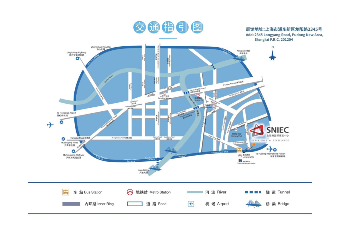 上海新国际博览中心(SNIEC)坐落于上海浦东经济与工业核心发展区。地铁7号线可直达SNIEC,其花木路站紧邻上海新国际博览中心W5号展厅。此外,大型交通枢纽中心一龙阳路站(位于龙阳路上) 距离SNIEC仅600余米,地铁2号线、地铁7号线、磁浮列车、以及多条公交线路交汇于此,由龙阳路站步行10分钟,即可抵达SNIEC。