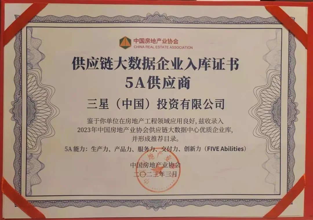 测评成果收录入中国房地产业协会建立的供应链大数据中心建立“5A供应商” (5A即生产力、产品力、服务力、交付力、创新力,FIVE ABILITIES)企业库。