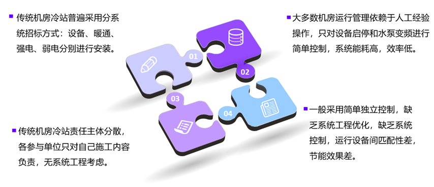目前传统冷冻机房建设模式存在诸多问题,如切包模式过多、管理繁杂、设计理念与施工建设配合不良、运维模式与设计初衷脱节等等,使得原本精心设计的机房与交付的机房相去甚远。