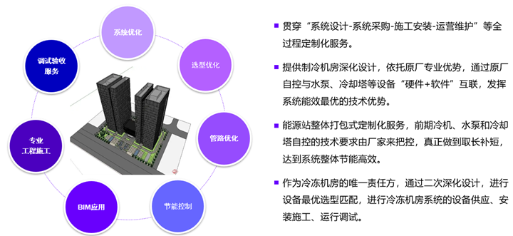 特灵客户解决方案业务部门配合四川能投分布式能源有限公司在本项目中为客户提供能源托管服务,定制冷冻机房整体解决方案。从系统设计优化、设备选型优化、节能技术应用等方面为客户提供冷冻机房整体解决方案和一站式冷冻机房交付服务。