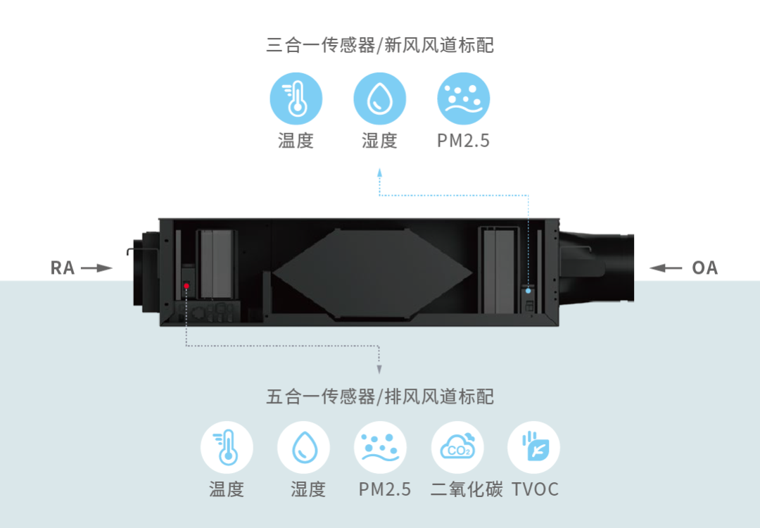 日立天净系列新风换气机配置五合一空气质量传感器可准确检测室内空气质量,三合一空气质量传感器检测室外空气质量,实时监测室内外空气品质,用户也可自由设定工作模式,智能便捷。