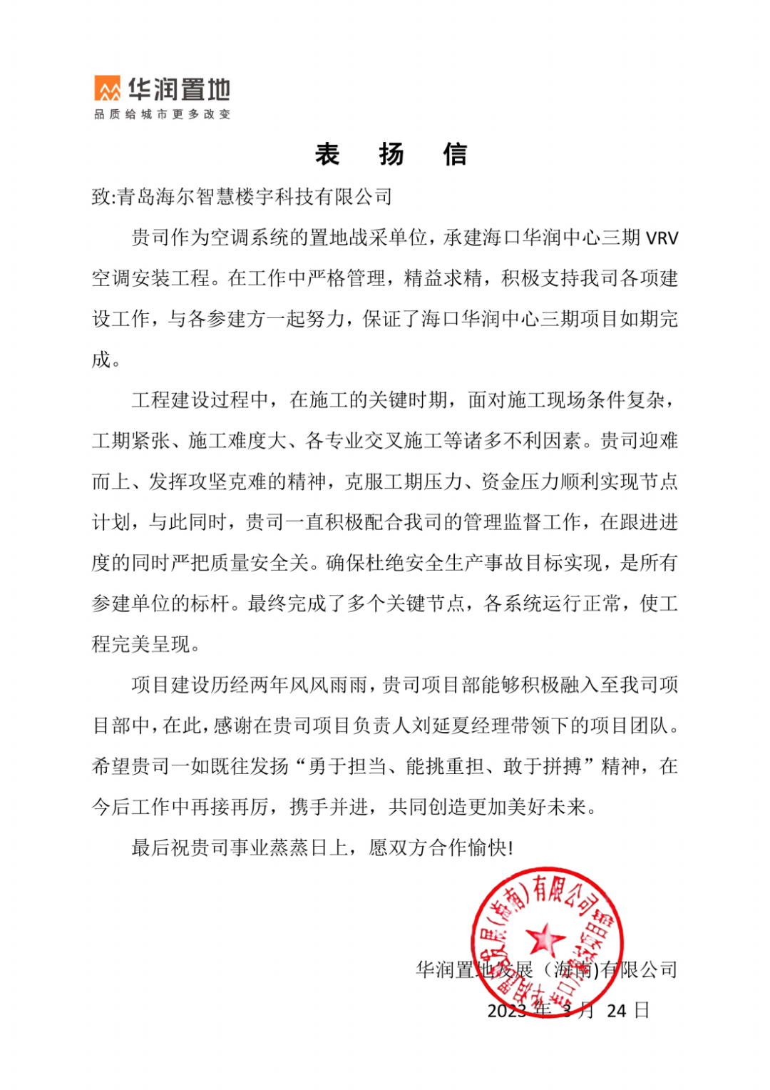 近日,海尔智慧楼宇收到了华润置地发展(海南)有限公司的表扬信,信中对海尔智慧楼宇在海口华润中心三期项目的积极支持及项目团队的拼搏精神,表示了高度赞扬及充分肯定,并表达了诚挚感谢。同时,项目方评价海尔智慧楼宇“是所有参建单位的标杆”!