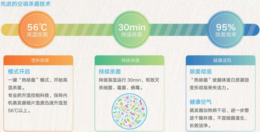 McQuay家用多联机采用先进的热除菌技术,采用强劲的动力输出及第5代智能能力控制系统,通过精准的升温技术,把室内机换热器翅片温度提升至56°C以上,把附着在空调上的细菌及病毒等灭杀。
