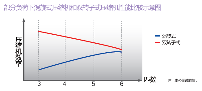 高效双转子压缩机双转子对称设计,使压缩机的运行更加平稳,马达驱动结构优化,低速运行情况下效率得到提升,定转子高度间隙优化,运行噪音更低;高压腔涡旋式增焓压缩机超精密加工的不对称涡旋盘设计,实现压缩机进气连续效果。融合增焓技术,可使系统在严寒气候下制热能量提升,