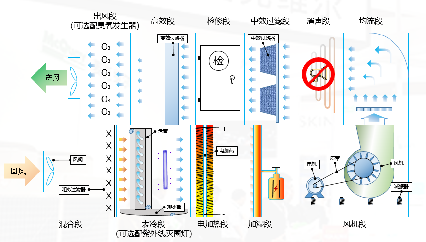 以上是一个涵盖了最常见功能段的组合式空气处理机组,我们以不同的功能段的维护保养来为大家一一分解。