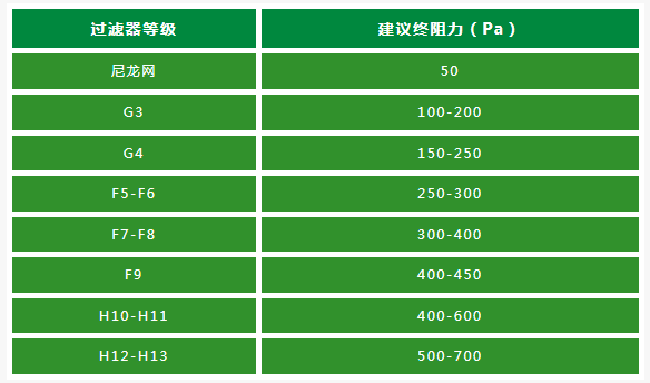 ● 定期检查、清洗/更换;定期检查压差计,查看过滤器前后压差,当压差值达到过滤器规定的建议终阻力(见下表)时,建议进行清洗或更换。(建议检查周期一般按每月1次,视使用场合而调整)