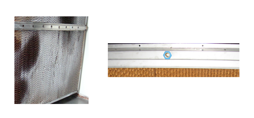 ● 湿膜加湿器:定期清洗检查,清洗湿膜表面的水垢,及布水器。除垢剂按一定比例兑水(视水垢多少而定),将湿膜浸泡在内直至表面无水垢即可。浸泡完毕后,用清水将湿膜冲洗干净,晾干即可。布水器的清洗,将布水器从边框上拆下,浸泡到清洗液中,清理淋水孔。如果孔堵塞严重,就需要用微针清理。(建议清洗周期:半年1次;建议更换周期:2-3年)