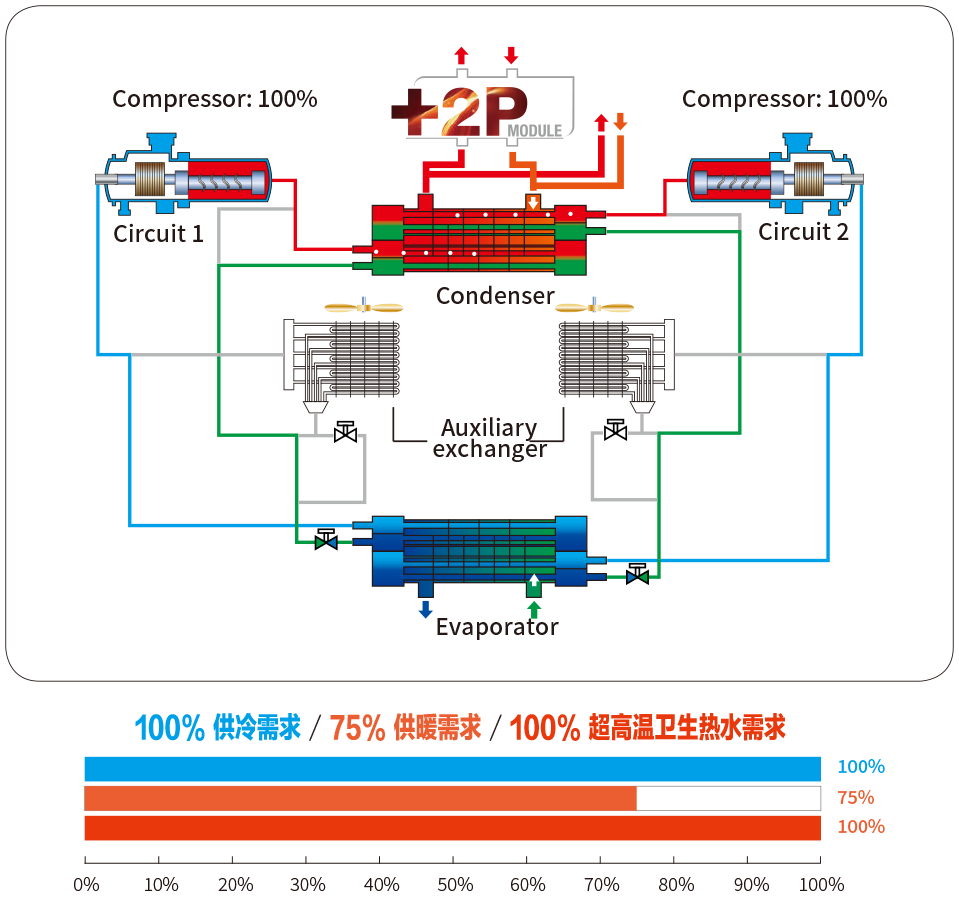 此时,冷凝器侧的一部分热水可通过 +2P 模块进一步加热,最高可加热至78℃。需要注意的是,此时冷凝器侧的水温不能超过 45℃。