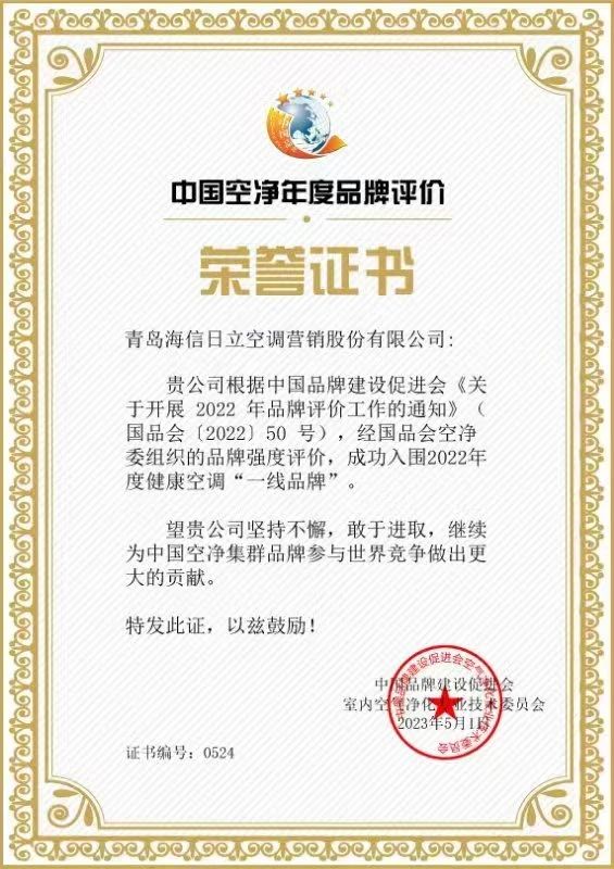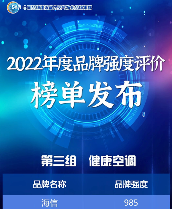 2023年5月10日,是第7个“中国品牌日”,今年的品牌日活动主题为“中国品牌,世界共享;品牌新力量,品质新生活”。在此背景下,中国品牌建设室内空气净化品牌集群组织开展了2022年度品牌评价活动,近日评选结果正式公布,海信中央空调以985分的品牌强度,名列健康空调组第一名。