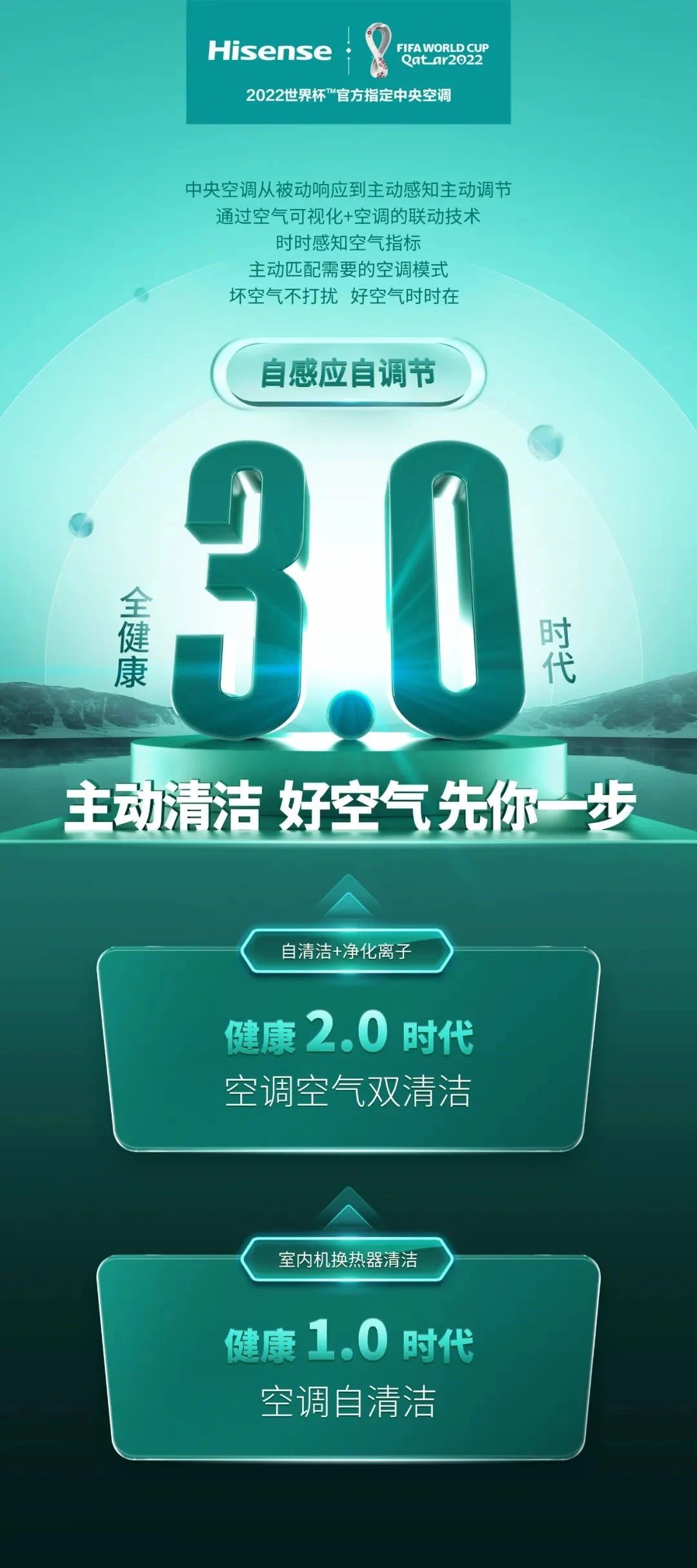 在此基础上,海信中央空调通过空气可视化与空调联动技术,实时感知室内空气指标变化,并主动匹配需要的空调模式,让用户轻松享受好空气的时刻相伴。从实现空调自清洁的健康1.0时代,到空调空气双清洁的健康2.0时代,再到自感应自调节、主动服务的全健康3.0时代,海信中央空调一直引领着中央空调技术的跃迁升级,为行业发展树立起新的标杆。