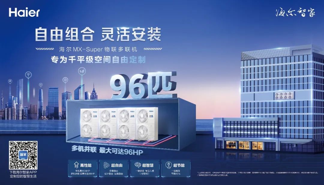 作为行业专利最多拥有者与技术领先者,海尔智慧楼宇持续加大物联多联机技术创新布局,聚焦差异化场景,推出MX-I无限冷暖、MX无线多联、MX-R无限焕新等产品系列。为满足用户对中央空调小型化、轻量化的需求,近期推出的海尔MX—Super物联多联机,以“自由组合 灵活安装”的优势,成为行业首个千平级空间智慧多联解决方案,引领行业发展新潮流。