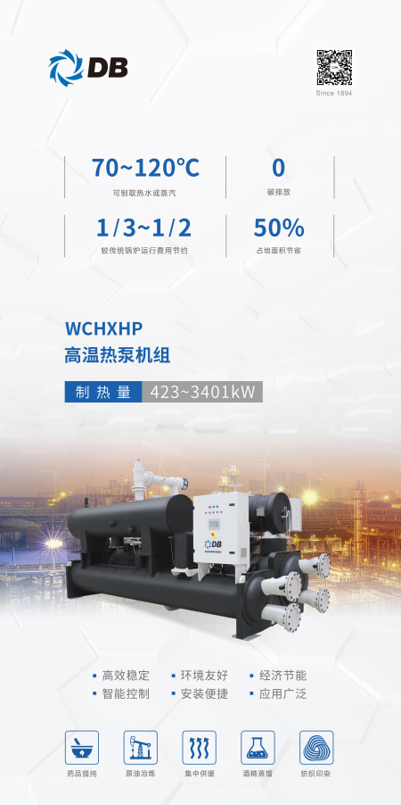 顿汉布什工艺用热泵机组回收供暖侧65℃的热水,将热水从70℃加热到80℃用于药剂加热。