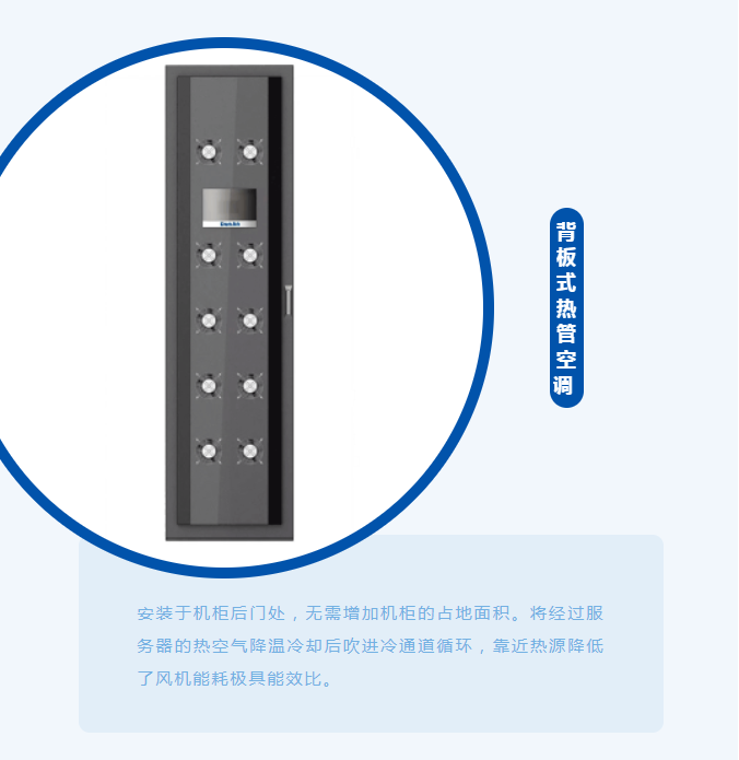 该系统可使用背板式热管空调、列间级热管空调、房间级热管空调等多种冷源,有着灵活的模块化设计和定制化服务,可分期施工扩容便利专利改造设计,自由安装,充分利用室外自然冷源,重力驱动无需额外功耗,热管制冷空调系统可实现上海地区PUE:1.25;北京地区PUE:1.20;西安地区PUE:1.22。