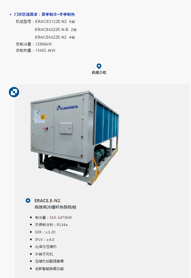 克莱门特结合徐汇区南部医疗中心自身条件,分别在南楼屋顶、综合楼屋顶、北楼屋顶、中楼屋顶、裙房屋顶放置机组,采用新型两管制风冷热泵和四管制风冷热泵机组,为门诊诊区,手术室,洁净室等区域解决夏季制冷,冬季制热,以及全年同时冷热和卫生热水需求,真正实现绿色医院解决方案。