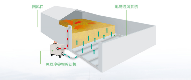 全系列采用全变频系统设计,结合高静压大风量送风设计,通过离心风机把粮仓顶部热空气吸入机组内部,热空气经过蒸发器后被冷却除湿,然后系统再把冷空气送入粮仓底部地笼,通过地笼送风系统,冷空气穿透粮堆,与粮食进行热湿交换,可快速降低粮堆内部温度,实现粮食整仓降温除湿的效果,保持仓内温度均匀,维持粮堆温度降低至15℃以下,为新粮储存质量提供保障。