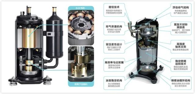 高效双转子压缩机双转子对称设计,使压缩机的运行更加平稳,马达驱动结构优化,低速运行情况下效率得到提升,定转子高度间隙优化,运行噪音更低;高压腔涡旋式增焓压缩机超精密加工的不对称涡旋盘设计,实现压缩机进气连续效果。融合增焓技术,可使系统在严寒气候下制热能量提升。